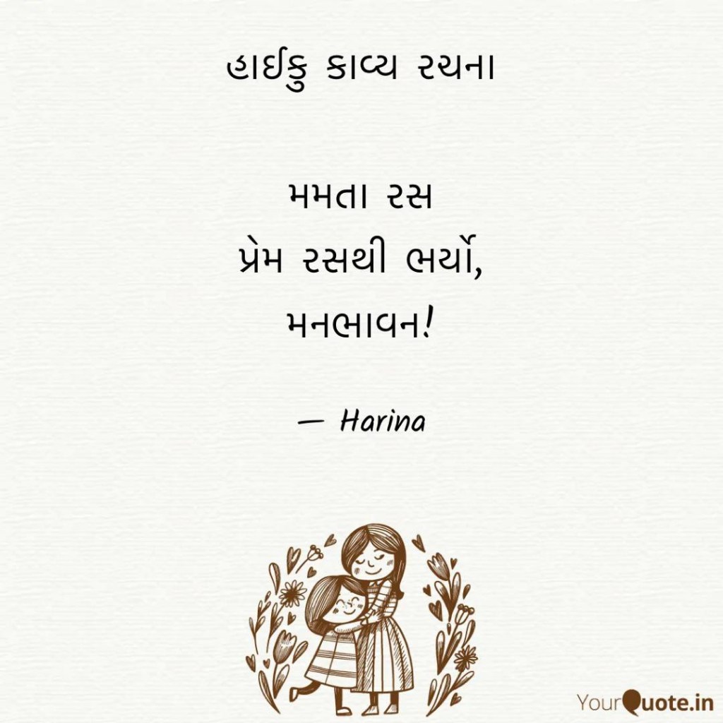 હાઈકુ કાવ્ય રચના (हाइकु काव्य रचना) ममता रस प्रेम रस से भरा, मनभावन! Share this: Click to share on X (Opens in new window) X Click to share on Facebook (Opens in new window) Facebook Click to share on WhatsApp (Opens in new window) WhatsApp Click to email a link to a friend (Opens in new window) Email Click to share on Telegram (Opens in new window) Telegram Like this:Like Loading... Related 4 thoughts on “હાઈકુ કાવ્ય રચના (हाइकु काव्य रचना)” Add yours Bilkul sahi ❤🤗💚 Loading... Reply Dhanyvad🤗 Loading... Reply Very very beautiful. Just like you, dear Sweet Harina. 💕💕💕♥️♥️♥️ Loading... Reply Thanks soo much aunty.. your compliments make my day always!🤗😍 Loading... Reply Leave a ReplyCancel reply